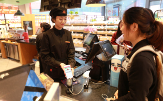 圖為雙11顧客在良品鋪子智慧門店憑電子券提貨