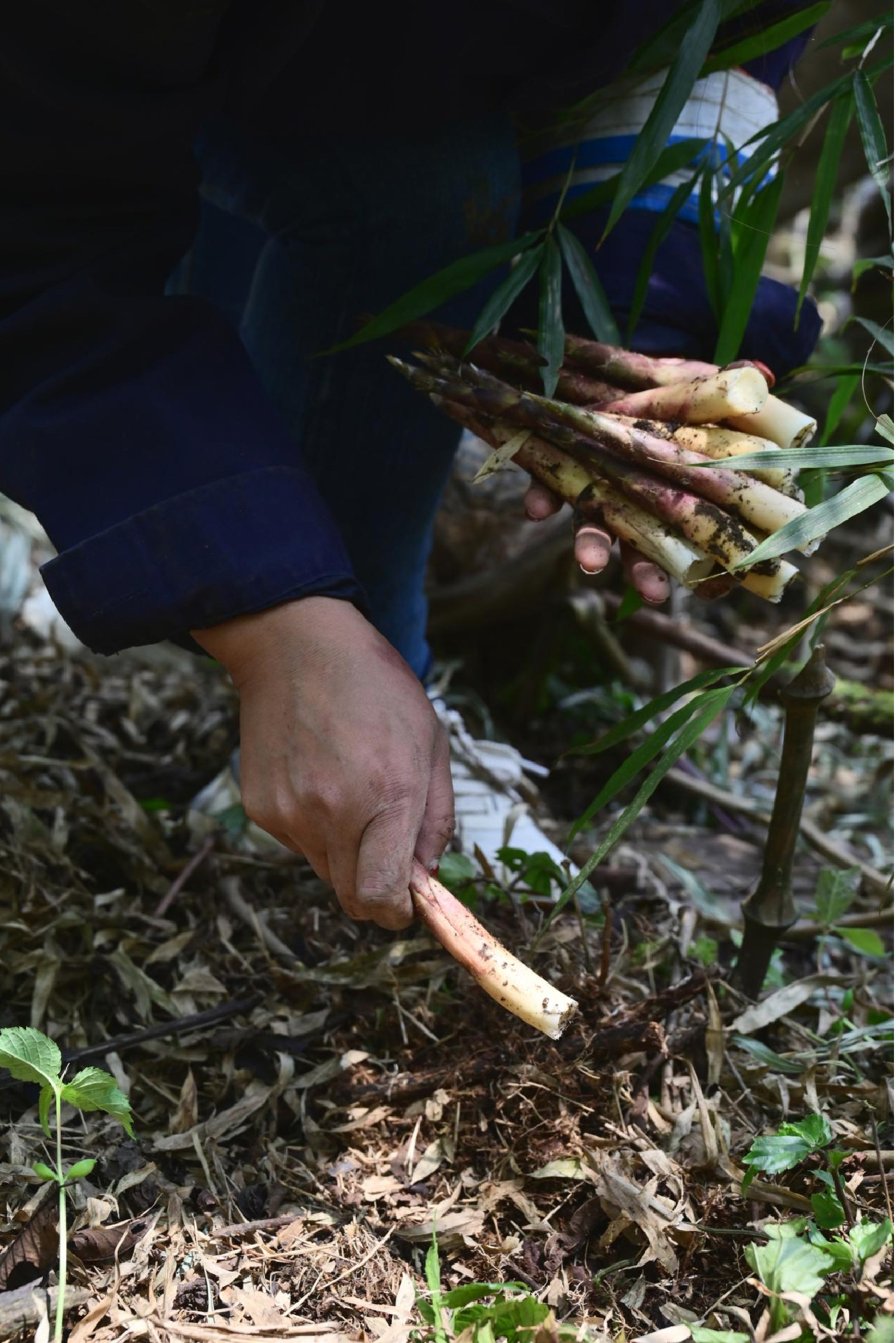 雨后的筇竹筍(又名“野生羅漢筍”)正簌簌拔節(jié)。這一個月是筇竹筍的采收季,筍農(nóng)從四面八方聚集而來,在茫茫竹海中攀爬,勞作一天滿載而歸,豐收喜悅的歌聲與春風(fēng)柔雨相和。
